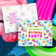 Invitation par carte postale pour la fête d'été. Ce design d’été tropical est parfait pour une fête d’adolescentes ou une fête de pool à la fin de l’école. Le texte de couleur vive correspond au design estival amusant qui comprend des images de lunettes de soleil, tongs, étoiles de mer, palmiers, coquillages, et plus imprimés sur bandes bleu clair et blanc. Le front a trois lignes pour customiser et dire, "Vous êtes invité à une fête d’anniversaire" avec un autre modèle de texte à l’arrière pour obtenir de l’information sur la fête. Tout le texte est facile à modifier pour n'importe quel type de partie.