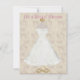 Invitation élégante de Fête de la mariée faite à un arrière-plan floral beige et rose doux, avec des graphiques d'une robe de mariage blanche sur un support d'or. Customisez tous les secteurs des textes sur l'arrière et avant de cette grande carte pour adapter à vos besoins. Changez le style de police, la taille, et les couleurs trop si vous voulez.