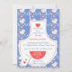 Cette invitation de douche de cuisine comporte une mitaine blanche toutes les deux de tablier et de four embellies avec les coeurs rouges. L'arrière - plan est une impression florale animée sur un arrière - plan bleu. Un grand invitation pour votre célébration.