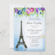 La sensation douce et romantique avec Tour Eiffel sur un fond bleu en pastel et un bruit lumineux d'aquarelle fleurit la danse à travers le dessus. Unique, frais et moderne avec le ressort coloré fleurit. Des bleus, des pourpres, des verts, et une éclaboussure du rouge - perfectionnez pour le mariage orienté français ou français. Éditez facilement pour votre propre douche nuptiale ou faire-part de mariage. Présentez vos invitations dans le style !