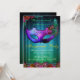 Invitation de fête de mascarade célébration paon. Une invitation élégante et chic présentant un masque de mascarade ton violet avec des fioritures noires et des faux rhinestones autour des yeux, un fond ombré bleu et vert avec un motif damassé subtil qui se fond dans le noir et un texte élégant personnalisable pour les détails de votre fête. Des plumes de paon ornent le masque et les bords inférieurs de l'invitation.