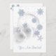 Cette invitation de fête de Noël ou de Noël est blanche, avec des ornements ronds et des flocons de neige bleu glace. Les informations sur les parties sont personnalisables.