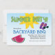 Cette fête d'été, invitation jardin barbecue offre un design aux couleurs vives qui comprend un soleil, des tongs, des lunettes de soleil et de la pastèque. Le texte personnalisable vous permet d'ajouter les détails de votre partie.