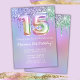 Invitation à la fête du 15e anniversaire parties scintillant rose violet goutte à l'invitation de la fête du 15e anniversaire pour une fille de 15 ans avec écriture de script moderne et des ballons de papier à papier amusant.