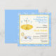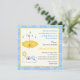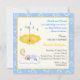 Invitation carrée de gâteau pour garçon bébé endormi, avec un bébé garçon endormi sur un nuage, un croissant de lune et une étoile au-dessus et un parapluie jaune avec des gouttes d'eau. Il y a une ligne jaune autour et une bordure bleue avec des cercles et des points blancs. Une invitation mignonne avec un bébé adorable parfaite pour un baptême ou une fête de bébé. Certains éléments sont de Trina Clark et sont utilisés avec l'aimable autorisation de vectorportal.com.