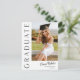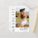 Cette élégante invitation à la graduation de photos design moderne comprend une photo verticale et un titre avec un nom de script personnalisable et du texte sur le devant. Le dos a une invitation avec les détails de la fête et une deuxième photo. Une excellente façon de présenter votre diplômé. Cliquez sur le bouton Modifier pour personnaliser cette conception.
