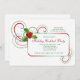 Une belle invitation qui est parfaite pour n'importe quelle célébration de vacances. L'arrière - plan de blanc comporte des remous de rouge et de vert et un groupe de houx au coin d'un panneau rectangulaire de message. Voulez épargner l'argent ? Imprimez cette conception sur le papier de coin de base et carré.
