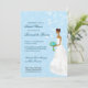 Une mariée marche sereinement dans l'allée sur cette adorable invitation à la douche nuptiale. Elle fait face au texte customisé sur le devant et a traversé la page à l'envers. L'arrière - plan est un joli motif bleu damassé recouvert de vignes florales tourbillonnant, tandis que le bouquet et les boucles d'oreilles de la mariée sont assortis au bleu. Disponible dans des couleurs alternatives avec des produits assortis et des options pour différentes ethnies mariées. Veuillez contacter ce magasin pour customiser cette invitation à des couleurs nuptiales spécifiques.