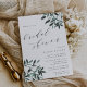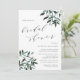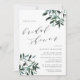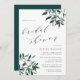 L'invitation à la douche nuptiale rustique et élégante présente des lettres riches en noir et blanc dans un bloc chic et en italique avec des accents calligraphiques, avec des sprays de feuillage aquarelle aux coins dans des tons riches de vert allant de la sauge à la forêt et le chasseur. Douche nuptiale Invitations inverse à vert foncé solide.
