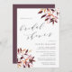 L'élégante invitation à la douche nuptiale rustique présente des lettres brun prune foncé dans un bloc chic et de l'italique avec des accents calligraphiques, avec des vaporisations de feuillage de chute d'aquarelle aux coins dans des tonalités de récolte d'automne riche de prune violette et dorée.