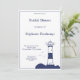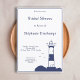 Elégante et simple invitation à la douche nuptiale avec une illustration d'un phare dans les tons bleu marine pour un mariage marin et nautique !