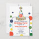 Une invitation à la fête d'anniversaire avec des couleurs bleu, orange, jaune et vert. Illustration d'un casquette de soirée à point de polka en haut. Les Pois entourent le texte personnalisable au centre. Personnalisez également le numéro du casquette.
