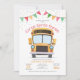 Invitation de fête de bus amusant préfet pour les petits à trois ans! L'invitation présente une illustration de bus jaune avec des confettis colorés et des drapeaux de fête. L'invitation se lit comme suit : Trois trois trois S'il vous plaît contactez-moi à claudia@claudiaowen.com si vous voulez customiser cette invitation. Veuillez visiter ma boutique Zazzle http://www.zazzle.com/claudiaowenshop Design par claudiaowen.com
