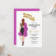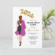 Graduation Party Invitation portrait féminin dessin robe noire, casquette rose et robe, cheveux longs rougeâtre brun. Ballons d'or 2024.