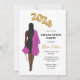 Graduation Party Invitation portrait féminin dessin robe noire, casquette rose et robe, cheveux longs foncés. Ballons d'or 2023.