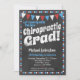 Une invitation amusante et unique à la fête de graduation Chiropractor dans le style tableau noir avec des drapeaux rouges, blancs et bleus et une bordure en pois blanc avec des points à l'arrière.