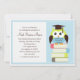 Une adorable invitation à la fête de remise des diplômes pour enfants avec un hibou vert et bleu assis sur une pile de livres. Graphiques ©Babystar Design.