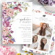 Invitation de la fête de graduation florale moderne. Annoncez la grande journée de votre diplômé avec une invitation magnifiquement conçue, avec un bouquet latéral gracieux de fleurs peintes à la main dans les tons de bijoux et une calligraphie raffinée pour une touche sophistiquée. De riches teintes de violet, magenta, bordeaux, rose vif, bleu poussiéreux et vert sauge fleurissent à l'avant, tandis que l'arrière offre de l'espace pour trois photos préférées. Personnalisez chaque détail - du libellé aux polices de caractères et aux arrière - plans - ce qui en fait un véritable reflet de leur personnalité. Créez une première impression époustouflante et fêtez ce jalon avec élégance !