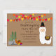 Joli lama dans un casquette de pèlerin et une couverture de tournesol. Drapeau de fête d'automne coloré, cactus en fleurs, et une cornucopie pour un Thanksgiving mignon et amusant.