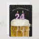 Numéro 24 bougie en tasse de bière avec confetti coloré sur noir pour l'invitation de fête du 24e anniversaire.