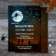 Une invitation magique à la fête d'Halloween avec un cimetière éffrayant en pleine lune avec une sorcière volant sur un balai, chauves-souris. Un arbre aux lumières étincelantes apporte une touche festive.