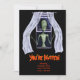 Cette invitation de la fête d'Halloween est entièrement personnalisable ! Invitation vos invités avec cette carte. Un alien effrayant qui passe par une fenêtre ouverte. Les trois doigts de la alien s'ouvrent derrière le rideau de la fenêtre. Il s'agit d'une peau ridée, d'une cage thoracique qui montre, d'une expression à l'air en colère, et le rideau transparent qui coule donne à cette illustration un air d'effroi obsédant. Le dos a la même image dans l'art en ligne noire et a toutes les informations du parti qui est simple à changer.