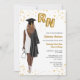 Invitation de la fête de fin d'études en sciences infirmières. Infirmière Invitation pour votre fille, nièce, mère, tante, cousin ou ami qui est diplômé de l'école de soins infirmiers et est maintenant officiellement infirmière. Invitation pour les grandes fêtes célébrant les femmes qui viennent d'obtenir leur diplôme de l'école de soins infirmiers. Célébrez la nouvelle infirmière autorisée avec cette élégante invitation de graduation en soins infirmiers! Portrait illustré d'une femme à la peau foncée aux cheveux longs et bouclés. L'infirmière grad porte une robe blanche élégante, une robe noire de graduation drapée sur son épaule et une casquette noire assortie. Elle tient des ballons de style feuille d'or avec les lettres RN d'une main et un stéthoscope de l'autre. Accentée de confettis dorés chatoyants, elle saisit parfaitement la joie et l'excitation de sa grande réussite.