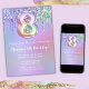 Invitation de fête de 8e anniversaire parties scintillant rose violet goutte d'invitation de fête de 8e anniversaire pour une fille de 8 ans avec écriture de script moderne et des ballons de papier amusant.