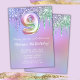 Invitation de la fête de 9e anniversaire parties scintillant rose violet goutte d'invitation de la fête de 9e anniversaire pour une fille de 9 ans avec écriture de script moderne et des ballons de papier amusant.