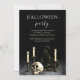 Cette élégante invitation d'Halloween est parfaite pour votre soirée d'Halloween à thème gothique. Le design présente un crâne gothique blanc, des bougies lumineuses et un casquette pointu de sorcières sur un arrière - plan sombre. Personnalisez avec les détails de votre fête.