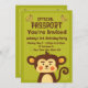 Envoyer des invitations pour une fête d'anniversaire d'enfant ? Cette invitation ludique sur le thème du passeport apporte une touche légère à une journée très spéciale. Modifiez le texte et personnalisez cette invitation à la perfection. L'illustration est celle d'un passeport amusant pour singe qui permet à un enfant chanceux d'assister à la fête.