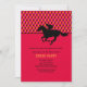 Une invitation sportive idéale pour une fête du Kentucky Derby ou pour toute occasion liée aux courses de chevaux. La carte présente un motif de Jacquard rouge, orange et noir sur le dessus, un solide fond rouge et un jockey en silhouette sur un cheval en noir.L'invitation est facile à customiser avec votre libellé, police, couleur de police et choix de six types de papier.