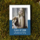 Faire-part de graduation en bloc couleur de l'école avec un design modèle photo à deux tons élégant et moderne en bleu. Ajoutez une photo et les détails de graduation pour customiser. La couleur de l'Arrière - plan à l'arrière de l'invitation peut être modifiée pour compléter la photo ou pour ajouter une couleur de l'école.