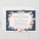 Une élégante invitation à la douche nuptiale fleurie comporte une plaque en ivoire portant vos détails de douche nuptiale et entourée de fleurs roses et crème, de verdure luxuriante et de minuscules bourgeons. Un riche arrière - plan bleu marine complète l'apparence. Personnalisez avec vos détails de douche nuptiale en lettrage blanc élégant. Les cartes renversent vers un motif de vignes subtil en rose vif et en ivoire.