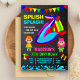 Éblouissez vos invités avec cette invitation de fête d'anniversaire colorée avec un toboggan aquatique magnifique et de mignons éléments de dessin animé avec typographie vibrante sur un arrière - plan de tableau noir. Ajoutez simplement les détails de votre événement sur ce modèle facile à utiliser pour en faire une invitation unique. Retournez la carte pour révéler une texture d'eau bleue au dos de la carte.