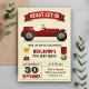 Invitation vos invités avec cette invitation de fête d'anniversaire cool avec une voiture de course vintage et des éléments de course avec typographie vibrante contre un arrière - plan beige vintage. Ajoutez simplement les détails de votre événement sur ce modèle facile à utiliser pour en faire une invitation unique. Retournez la carte pour révéler une texture rustique en bois de grange au dos de la carte.