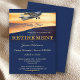 Invitation d'une partie de retraite avec une image d'un avion décoller en liberté. L'arrière - plan est bleu marine avec une légère texture (imprimée) et un décor de fond doré.