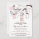 Invitation à une fête de fiançailles fantasque avec des fleurs roses et des jarres de mason. Parfait pour les fêtes de printemps.