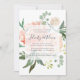 Élégante et moderne invitation à la fête florale présente un bouquet de douces pivoines pastel dans les tons rose pâle, pêche et crème, avec des feuilles botaniques verdoyants et des eucalyptus. Les détails de votre fiançailles sont superposés sur un élément blanc pur dans un élégant lettrage bleu fumée accentué par la calligraphie manuscrite.