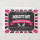 Une invitation à une soirée bachelorette avec un facteur WOW. Cette invitation branchée présente une bordure rose, noir et blanc aux rayons chauds avec un panneau décoratif noir pour vos informations de fête. Les mots "bachelorette party" sont pré-imprimés et ornés d'une paire de talons hauts, d'une bannière et de diviseurs gigognes. L'arrière offre beaucoup d'espace si vous souhaitez ajouter plus de détails. (Invitation à la fête de la bachelorette par carterart). La carte est facile à customiser avec votre libellé, police, couleur de police, options de forme de papier et choix de six types de papier.
