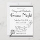 Cette élégante invitation à une soirée de jeu est composée d'un arrière - plan blanc au style noir, rétro, texte sophistiqué. Le texte peut être modifié et personnalisé à vos propres informations personnelles. Les mots "Game Night" sont imprimés en gros caractères sophistiqués devant l'invitation. Une image de dés noirs et blancs est placée à droite du texte et une carte à jouer illustrée est imprimée à gauche. L'arrière de l'invitation comporte un arrière - plan noir solide.