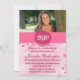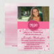 Ce invitation de la fête de remise de diplômes a une bordure rose grunge et un cercle avec l'année du diplômé imprimé dans une police grungy blanche. Le sommet du invitation 5x7 a un endroit où vous pouvez customiser votre photo personnelle. Dans la partie inférieure, vous pouvez facilement personnaliser vos informations de fête. Le texte en bas est écrit dans une police de cool rose-chaud.