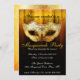 Invitation de luxe dorée pour célébration de soirée masquée. Une invitation élégante et raffinée présentant un masque de soirée masquée doré avec des fioritures noires, un fond doré avec un motif damassé subtil se fondant dans du noir et une typographie élégante personnalisable pour les détails de votre soirée.
