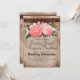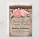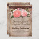 Faire-part de mariage de vignoble en bois de tonneau de chêne rustique et dentelle en toile de jute avec bouquet rose et blanc de fleurs de pays.