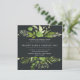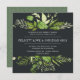 Notre invitation de mariage de Midnight Garden dans un format carré unique encadre vos détails mariages avec une bordure supérieure et inférieure de verdure d'aquarelle peinte dans des tons luxuriants de vert printemps, d'olive et de fougère. Un choix moderne et bio pour les mariages du printemps ou de l'été avec des feuilles verts frais dans la couleur de l'année 2017, face à un élégant arrière - plan foncé.