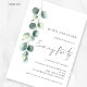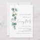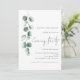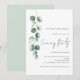 Invitation de mariage moderne sous les feuilles d'eucalyptus et de sauge pour une soirée. Disponible numériquement et imprimée. Un style botanique minimaliste pour inviter vos invités à votre mariage en soirée. Un ensemble de texte manuscrit pour la soirée et le reste du texte que vous pouvez facilement personnaliser. Une branche élégante de feuilles d'eucalyptus à l'aquarelle descend le long du côté gauche.