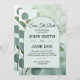 Cette faire-part de mariage minimaliste est décorée dans des tons verts doux et présente un design simple en arc, agrémenté de délicats feuilles d'eucalyptus. Parfait pour une mariage moderne ou rustique."