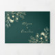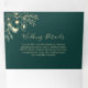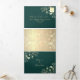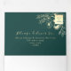 Invitation de mariage triple pli 3 en 1 vert émeraude simple, élégante et moderne, avec des fleurs art déco dorées et une photo du couple.