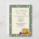 Invitation à la fête du thé de Noël, faite dans un vert sage, avec des flocons de neige en ivoire, des arbres et motif de stockage. Une zone de texte en ivoire doré, a des graphiques d'une tasse de thé dorée, décorant le fond de la zone de texte. Personnalisez les champs de texte personnalisés pour répondre à vos besoins de fête du thé de vacances.