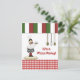 L'invitation mignonne de partie de pizza avec le chef italien se tenant sur des ustensiles de goupille et de cuisine avec le rouge a vérifié la frontière inférieure et rayé rouge, blanc et vert pour encadrer.